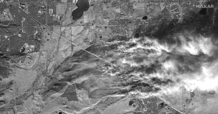 Image satellite montrant les incendies près des villes de Superior et de Louisville, dans le Colorado, le 30 décembre 2021 - [Satellite image ©2021 Maxar Technologies/AFP]MERCI DE VOUS IDENTIFIER