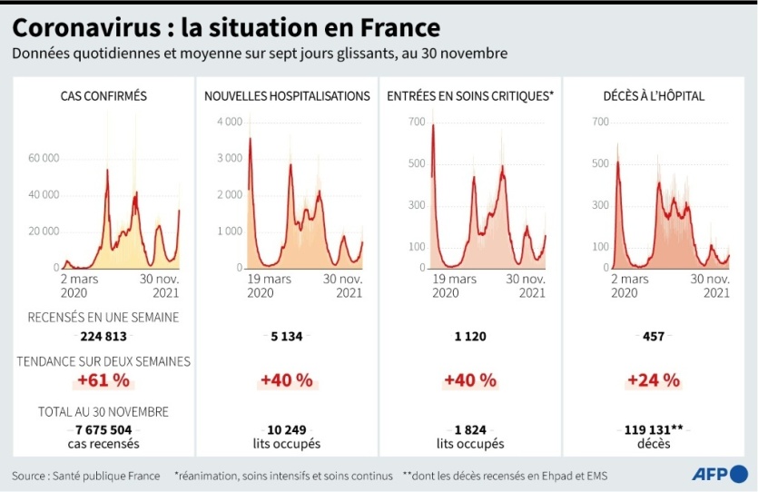 - | Crée le 01.12.2021 à 13h48 | Mis à jour le 02.12.2021 à 01h20ImprimerUn soignant intervient auprès d'un malade du Covid dans une unité d'urgence à l'hôpital de la Pitié-Salpetrière à Paris, le 30 novembre 2021 Thomas SAMSON [AFP]La cinquième vague de Covid montait doucement en réanimation mais "depuis ce weekend, ça flambe" dans un grand hôpital parisien, où l'afflux de malades non vaccinés ravive les "souvenirs pénibles" de soignants "usés" par l'épidémie.