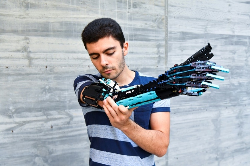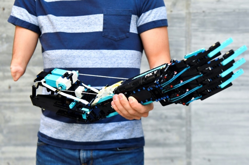 Et aujourd'hui, il présente fièrement la cinquième version de sa prothèse, la MK5, un bras en Lego d'aspect robotique avec des barres bleues faisant office de doigts que David active d'un mouvement de son moignon, grâce à un système de poulies motorisées.