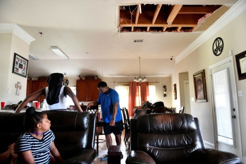 Des membres de la famille Arceneaux observent le plafond effondré de leur domicile, à Laplace, en Louisiane, le 30 août 2021 Patrick T. FALLON [AFP]