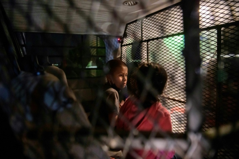 Deux enfants guatémaltèques attendent dans un fourgon policier après être entrés illégalement aux Etats-Unis à Roma, au Texas, le 27 mars 2021 Ed JONES [AFP]