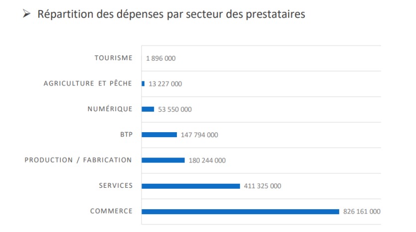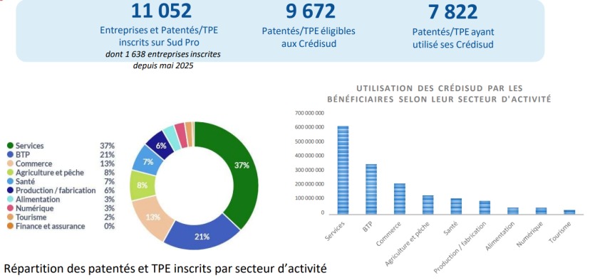 Lancé le 5 mai et clôt le 15 novembre, Sud Pro s’est d’abord traduit par la création d’une plateforme numérique de mise en relation des entreprises. En près de huit mois, 1,7 milliard de francs de crédits ont été versés à 7 832 structures, ce qui représente 14 280 factures payées et une dépense moyenne de 214 362 francs par bénéficiaire. Selon la province, la plateforme "a généré un chiffre d’affaires de 1,9 milliard de francs, dont 225 millions non payés en Crédisud", explique Charlène Gautier. L’argent a principalement bénéficié au secteur du commerce, quincaillerie, matériel informatique, etc., puis aux services, à la production et la fabrication artisanale ou industrielle, au BTP, au numérique et à l’agriculture et à la pêche.