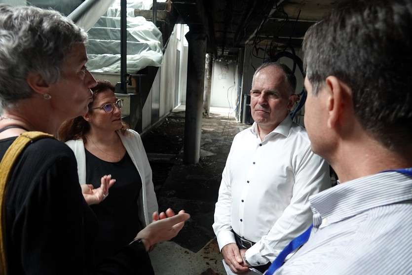 - Baptiste Gouret | Crée le 15.04.2025 à 15h52 | Mis à jour le 17.04.2025 à 10h24ImprimerLe haut-commissaire Louis Le Franc, aux côtés de la présidente de la province Sud Sonia Backès, échange avec l’architecte du pôle technique de la DAEM, ce mardi 15 avril. Le bâtiment, inauguré en avril 2024, a été incendié trois semaines plus tard lors de Photo Baptiste GouretSitué à l’entrée de la Vallée-du-Tir, le bâtiment avait été incendié à deux reprises aux premiers jours des émeutes. Le haut-commissaire Louis Le Franc et la présidente de la province Sud Sonia Backès ont visité les lieux, ce mardi 15 avril, avant le lancement des travaux de rénovation financés à 80 % par l’État, premier chantier d’une reconstruction publique chiffrée à 2,2 milliards de francs pour la Maison bleue.