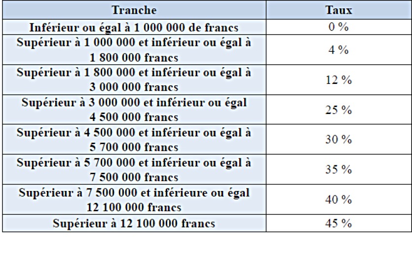Le texte prévoit de rendre ce barème davantage progressif avec l’ajout de trois tranches d’imposition, passant de cinq actuellement en vigueur à huit. La première serait fixée à 30 % pour les revenus annuels compris entre 4,5 et 5,7 millions de francs et la deuxième à 35 % pour ceux compris entre 5,7 et 7,5 millions. Un nouveau taux d’imposition maximal, établi à 45 % pour les revenus supérieurs à 12,1 millions de francs par an, serait également mis en place.
