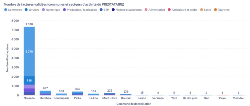 Les bénéficiaires ont dépensé en moyenne 222 593 francs. Les entreprises inscrites sont essentiellement domiciliées à Nouméa (7 260), Dumbéa (486), Païta (410) et le Mont-Dore (215), et ont une activité dans les secteurs des services (38 %), du BTP (21 %) et du commerce (13 %). À noter que sur l’ensemble des factures, 393 concernaient l’achat de matériel numérique, c’est-à-dire ordinateur et smartphone.