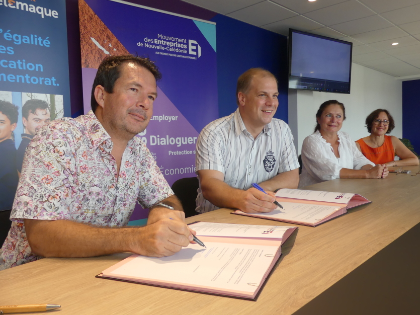 - Baptiste Gouret | Crée le 05.04.2024 à 14h06 | Mis à jour le 05.04.2024 à 14h07ImprimerGil Brial, deuxième vice-président de la province Sud en charge de la jeunesse, et Julien Barras, président de la commission emploi-formation du Medef, ont signé une convention de partenariat pour permettre à l’organisation patronale de prendre part au di Photo Baptiste GouretL’organisation patronale va identifier deux ou trois entreprises adhérentes susceptibles d’accompagner des jeunes collégiens ou lycéens vers la réussite. Elle a signé une convention de trois ans avec la province Sud.