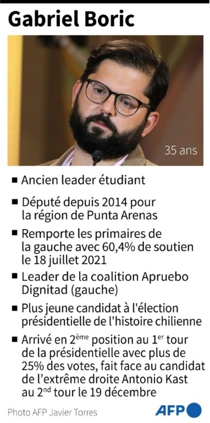 Gabriel Boric, député depuis 2014, dirige une coalition de gauche avec le Parti communiste. Il se présente comme le candidat du changement et l'héritier politique du mouvement de 2019 pour davantage de justice sociale dans le pays le plus inégalitaire de l'Organisation de coopération et de développement économiques (OCDE).