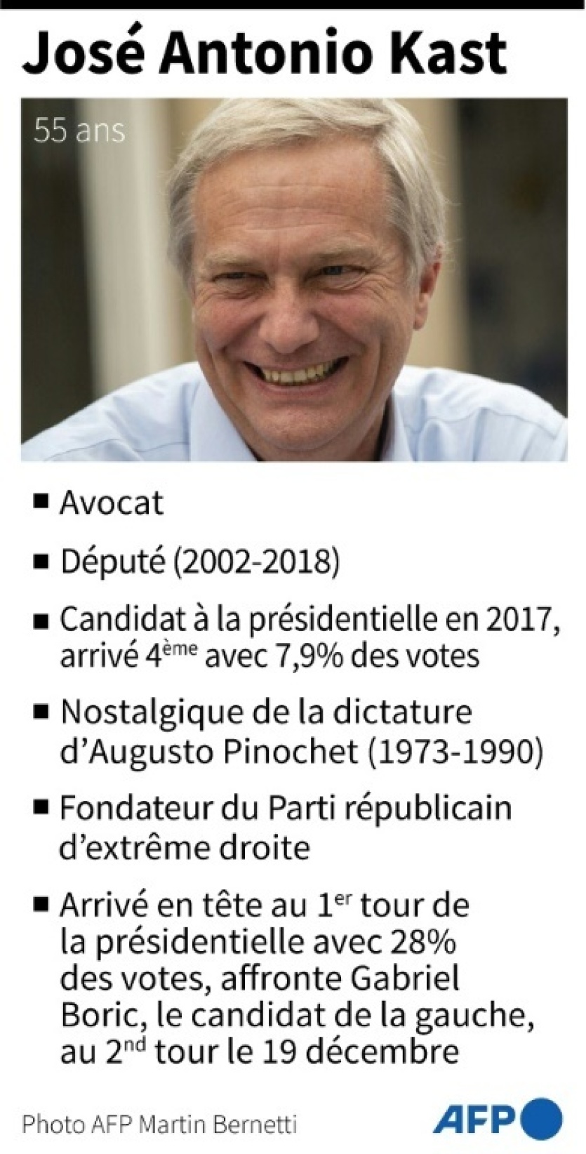 Arrivé en quatrième position en 2017 (7,93%), M. Kast a triomphé au 1er tour fin novembre (27,9% contre 25,8% à M. Boric) à la tête du parti d'extrême droite "Les Républicains" qu'il a lui même créé en 2018.
