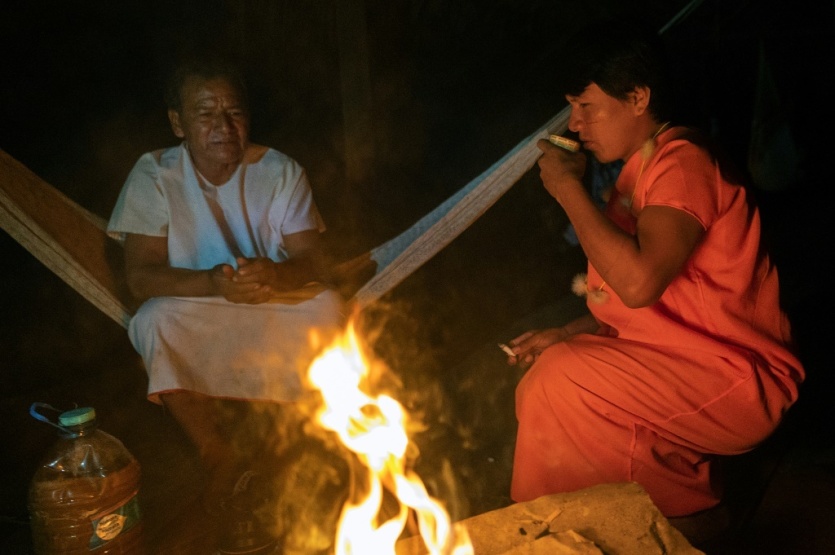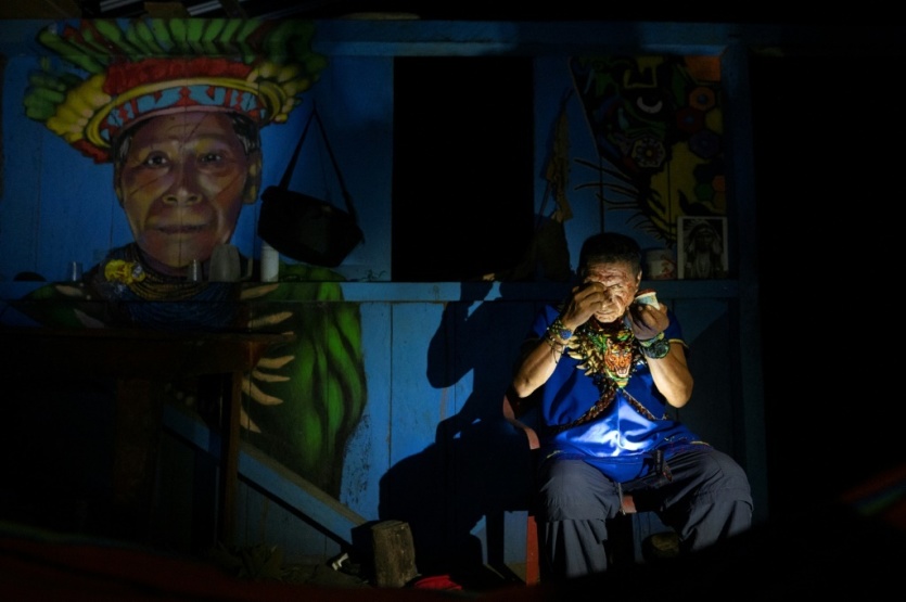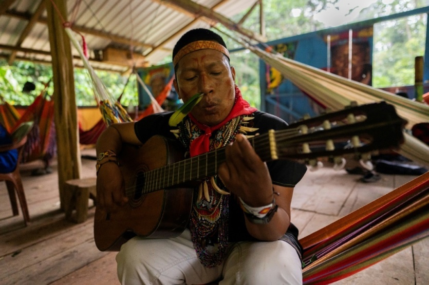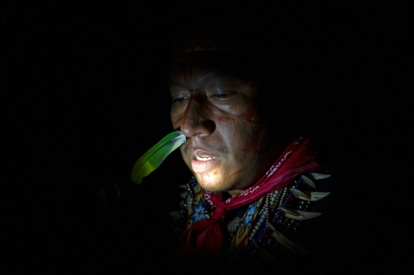 Collier de dents de pécaris sur la poitrine, foulard rouge autour du cou et plume en travers du nez, ce "héros de la biodiversité", comme le désignent certaines ONGs, officie ce soir au côté de son père comme assistant et chanteur à la guitare pour accompagner le voyage et la transe des participants.