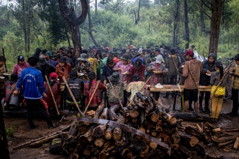 Des recrues des rebelles anti-junte pendant une pause déjeuner lors de leur entraînement dans une forêt de l'Etat Karen, en Birmanie, le 16 octobre 2021 STR [AFP]