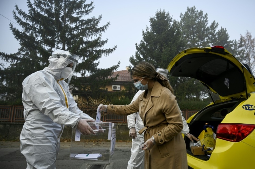 Un assesseur d'un bureau de vote mobile, revêtu d'une combinaison de protection contre le coronavirus, recueille le vote au second tour de la présidentielle d'une femme dans le village de Voluek (Bulgarie), le 2 novembre 2021 Nikolay DOYCHINOV [AFP]