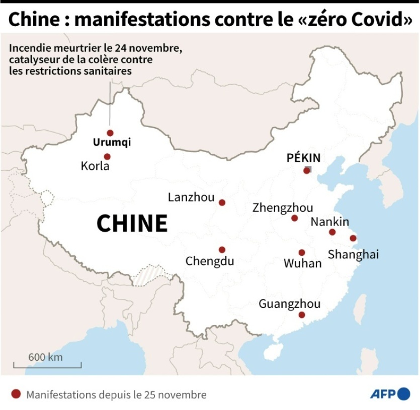 - | Crée le 28.11.2022 à 05h54 | Mis à jour le 29.11.2022 à 08h24ImprimerManifestation contre la politique "zéro Covid" du gouvernement chinois, le 28 novembre 2022 à Pékin Noel CELIS [AFP]Les autorités chinoises tentaient lundi d'enrayer le mouvement de colère contre les restrictions sanitaires et en faveur de plus de libertés, des manifestations d'une ampleur historique et soutenues à l'étranger, notamment par les Nations unies.
