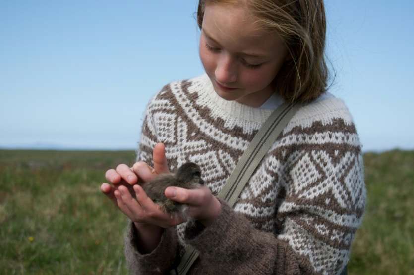 Bryndis Jonsdottir, 11 ans, nièce d'Erla Fridriksdottir, câline un caneton d'eider sur l'île de Bjarneyjar dans la baie de Breidafjordur, en Islande, le 4 juillet 2021 Jeremie RICHARD [AFP]
