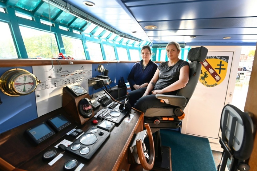 Cindy Francisco (g) et Cathy Maka, les filles de François Zanella, à l'intérieur de la réplique du "Majesty of the Seas", le 11 octobre 2022 au port de Sarreguemines, en Moselle Jean-Christophe Verhaegen [AFP]