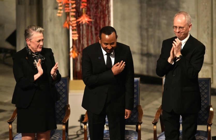 Abiy Ahmed reçoit le prix Nobel de la paix des mains de la présidente du comité norvégien du prix Nobel de la paix Berit Reiss-Andersen (g) et de son vice-président Henrik Syse, à Oslo le 10 décembre 2019 Fredrik VARFJELL [AFP/Archives]