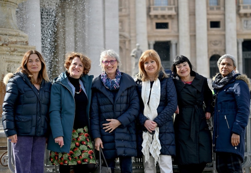 (De gauche à droite) Maria Cristina Grimaldi, Margherita Romanelli, Adriana Masotti, Roberta Gisotti, Romilda Ferrauto et Maria Dulce Araujo, membres de l'association "Donne in Vaticano", posent sur la place Saint-Pierre de Rome, au Vatican, le 6 mars 2023. Filippo MONTEFORTE [AFP]