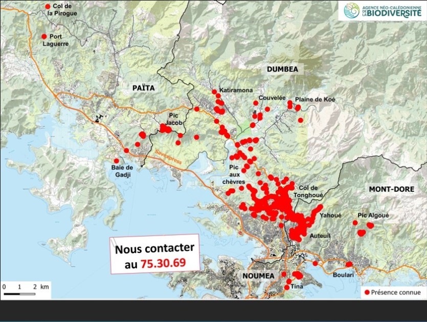 Nouméa, avec quelques spécimens implantés jusqu’au col de la Pirogue (le plus au nord) ainsi qu’à Tina et dans le secteur de Boulari (le plus au sud), soit une surface totale de 7 000 hectares.
