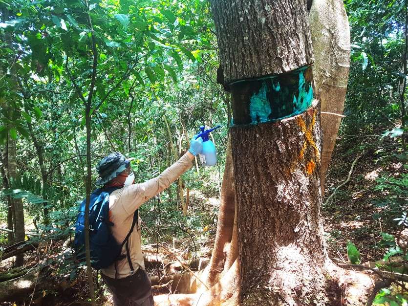 Les agents écorcent une partie de l’arbre avant d’utiliser du colorant pour marquer les arbres en cours de traitement.Lors de la dernière campagne d’élimination menée au Col de Tonghoué, à Dumbéa, le bilan de l’abattage des arbres s’est révélé peu probant, puisque les agents ont constaté quelques mois après "une reprise importante de la croissance et de rejets".