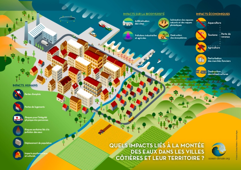 Illustration Ocean & climateParfois, l’échelle ne sera pas seulement locale mais au niveau interinsulaire voire international. Même si la délocalisation est une solution de dernier recours, Kiribati a développé une stratégie de migration internationale avec la Nouvelle-Zélande et l’Australie.