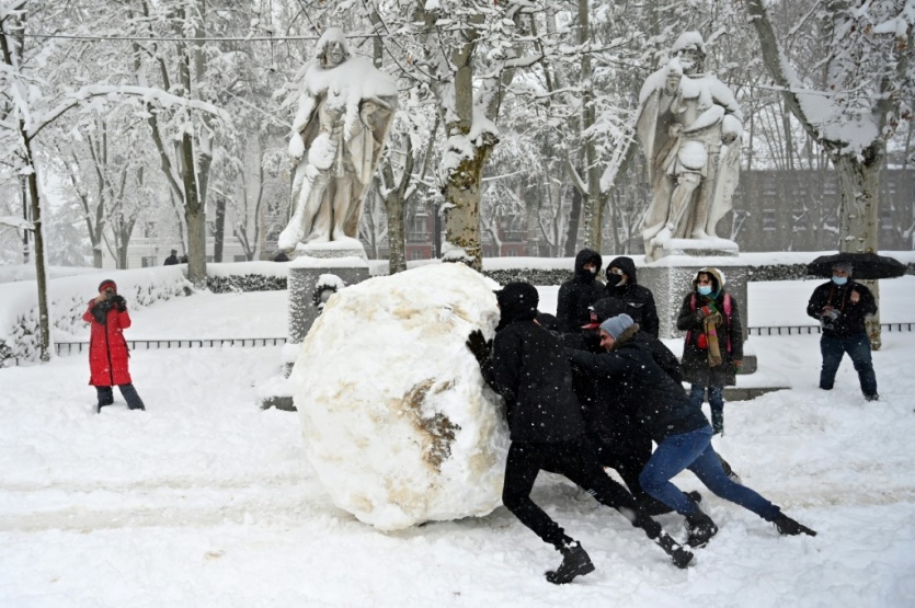 Des jeunes font une boule de neige géante à Madrid l 9 janvier 2021. Gabriel BOUYS [AFP]MERCI DE VOUS IDENTIFIER