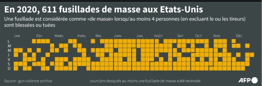 Les armes à feu ont fait plus de 43.000 morts, suicides inclus, aux Etats-Unis en 2020, selon le site Gun Violence Archive qui a dénombré 611 "fusillades de masse" -au moins quatre victimes- en 2020 contre 417 l'année précédente.