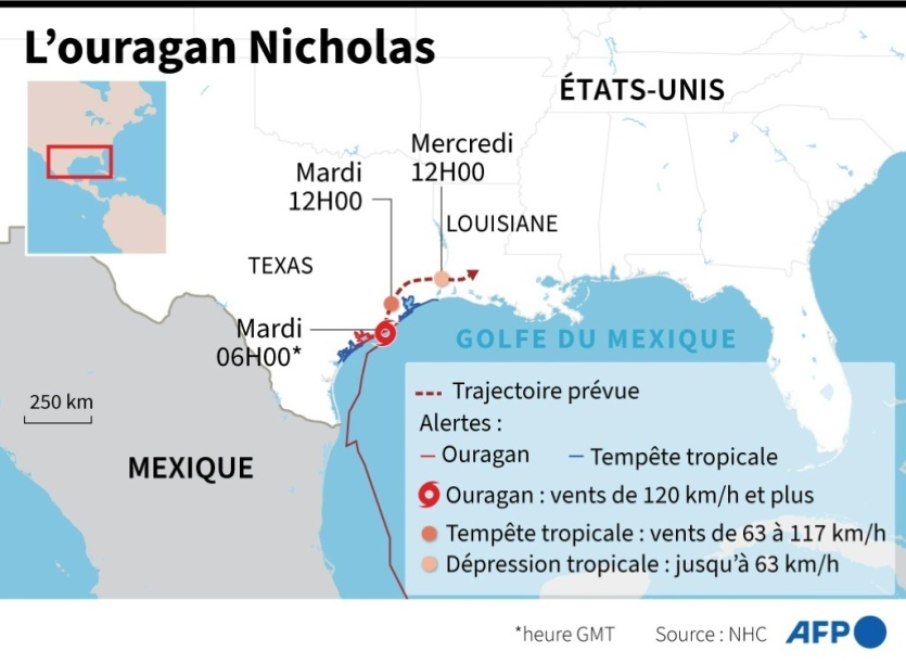 Dans son dernier bulletin, à 09H00 GMT, le Centre national des ouragans (NHC) explique que la tempête tropicale Nicholas, avec des vents de près de 110 kilomètres par heure, devrait progresser lentement vers le nord-est, puis l'est mercredi au dessus de la Louisiane. Elle devrait s'affaiblir mardi avant de devenir une dépression tropicale d'ici mercredi.