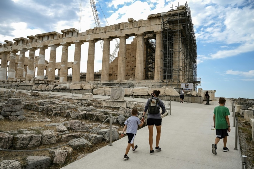 Des touristes visitent le temple du Parthénon sur l'Acropole à Athènes, le 4 juin 2021 Aris MESSINIS [AFP/Archives]