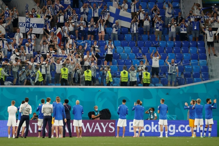 Les joueurs finlandais communient avec leurs supporters dans une tribune du stade de Saint-Pétersbourg à l'issue du match contre la Belgique, le 21 juin 2021 Anatoly Maltsev [POOL/AFP/Archives]