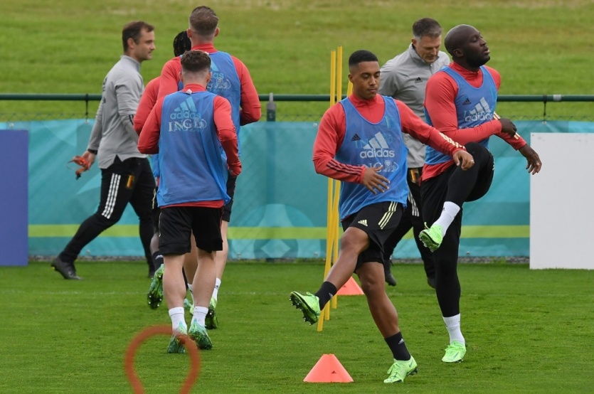 Youri Tielemans (C), Romelu Lukaku et leurs coéquipiers belges lors d'une séance d'entraînement à Tubize, le 30 juin 2021, à trois jours du match contre l'Italie JOHN THYS [AFP]