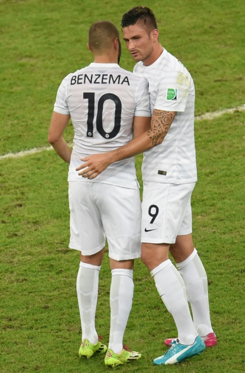 Les avant-centres de l'équipe de France Karim Benzema (de dos) et Olivier Giroud (droite), le 26 juin 2014, lors d'un match des Bleus au Mondial-2014 à Rio de Janeiro WILLIAM WEST [AFP/Archives]