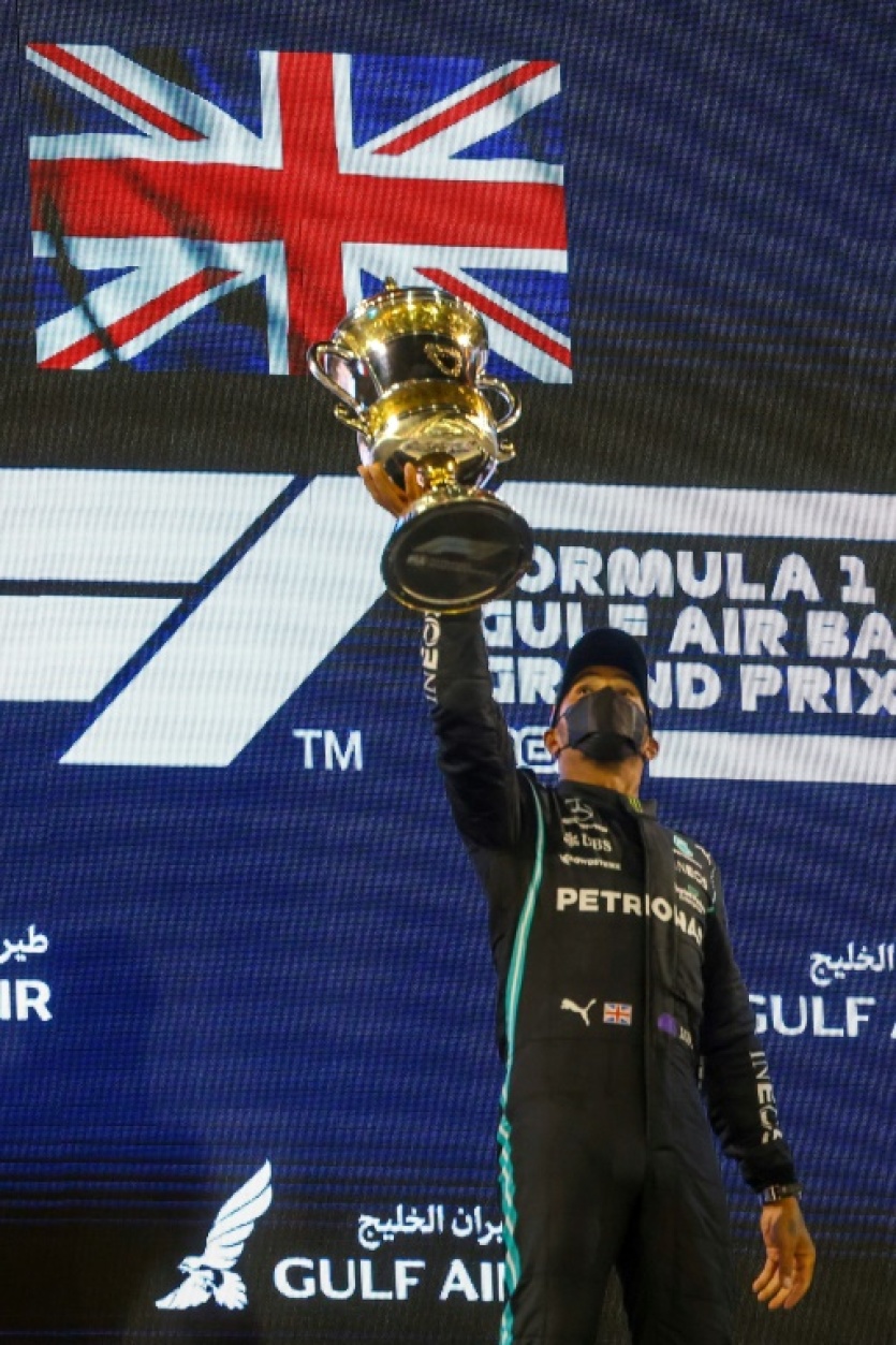 Le pilote britannique Lewis Hamilton, vainqueur du Grand Prix de Bahreïn, le 28 mars 2021 sur le circuit international de Sakhir Giuseppe CACACE [AFP]