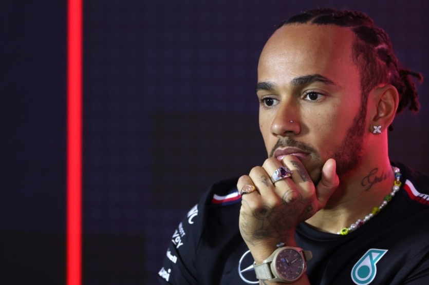 Le pilote britannique Lewis Hamilton, lors du conférence de presse le 25 février 2023, à quelques jours du GP de F1 de Bahreïn Giuseppe CACACE [AFP]