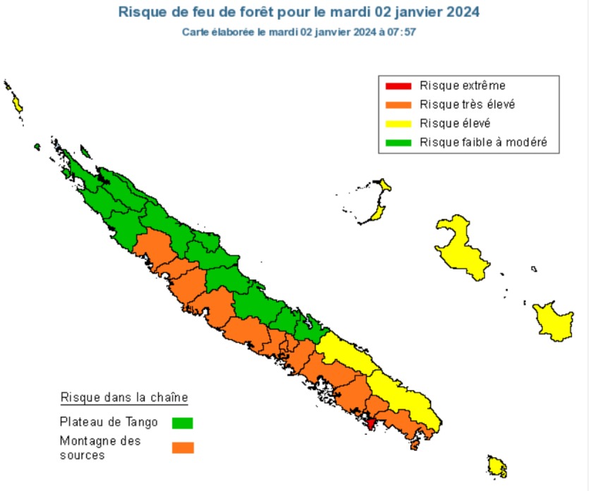 Ce mardi 2 janvier, Nouméa est encore placée en "risque extrême" pour les feux de forêt. C’est la seule commune du pays qui figure en rouge. À noter que le risque reste très élevé sur la côte Ouest jusqu’à Voh.