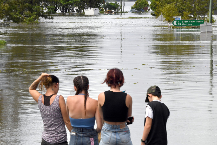 Des habitants se tiennent près d'une rue inondée dans la banlieue de Lawrence, à quelque 70 kilomètres de la ville frontalière de Lismore en Nouvelle-Galles du Sud, le 1er mars 2022. AFP - SAEED KHANA Lismore, qui n'a jamais d'inondation de cette ampleur, la députée locale, Janelle Saffin, a dû nager pour se mettre à l'abri après avoir été bloquée par les eaux de crue.