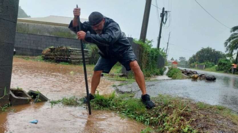Hors centre-ville, au PK 3, à Afaahiti, les riverains se sont mobilisés pour tenter de faciliter l’écoulement de l’eau, comme Ruben avec sa barre à mine plantée avec force à l’entrée du caniveau qui longe sa clôture. "On a pris l’habitude. Depuis des années, c’est comme ça : l’eau descend du plateau et les caniveaux débordent. On a eu de l’eau et de la boue jusqu’aux genoux chez nous. On s’y attendait, mais à force, c’est épuisant ! Ce serait bien de trouver enfin une solution", lance-t-il.