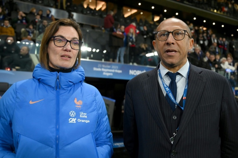 La sélectionneuse de l'équipe de France Corinne Diacre et le président intérimaire de la FFF Philippe Diallo, avant un match des Bleues face à la Norvège, le 21 février 2023 à Angers JEAN-FRANCOIS MONIER [AFP/Archives]