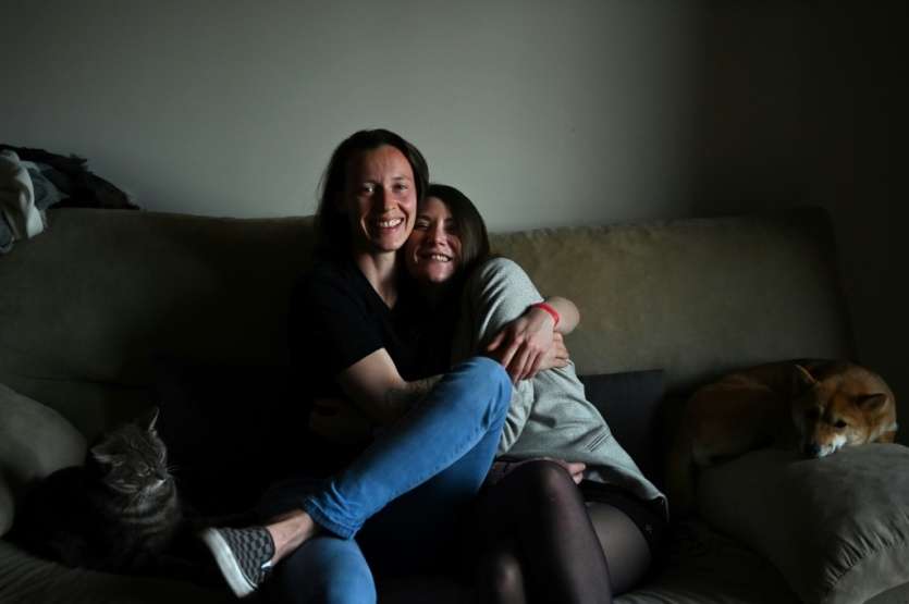 La gardienne des Bleues et de l'Atlético Madrid et sa compagne Camille, employée aux douanes à Roissy, ont reçu l'AFP chez elles, dans l'intimité de leur appartement de la banlieue de la capitale espagnole, pour un entretien entre leurs chats, leurs chiens et une écharpe rouge et blanche de l'"Atleti".