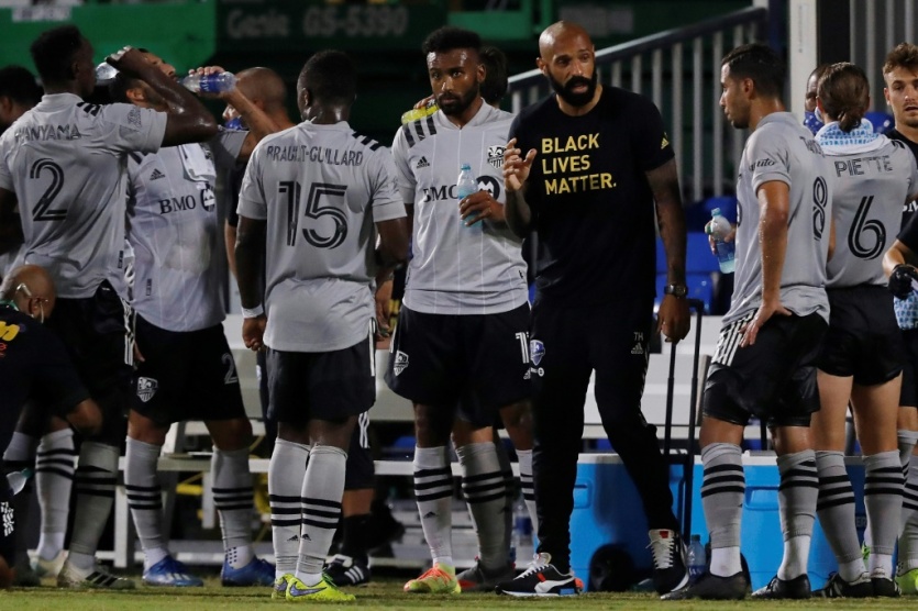 L'entraîneur du CF Montreal Impact, le Français Thierry Henry, discute avec ses joueurs, lors d'un match du Tournoi "MLS is back" contre le Toronto FC, le 16 juillet 2020 à Réunion, en Floride Michael Reaves [GETTY IMAGES NORTH AMERICA/AFP/Archives]