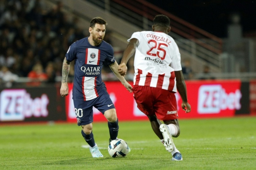 La star du PSG Lionel Messi devant le défenseur d'Ajaccio Oumar Gonzalez, le 21 octobre 2022 à Ajaccio Pascal Pochard-Casabianca [AFP]MERCI DE VOUS IDENTIFIER