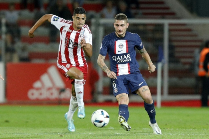 Le Parisien Marco Verratti (d) devance l'attaquant d'Ajaccio Mounaim El Idrissy, le 21 octobre 2022 à Ajaccio Pascal Pochard-Casabianca [AFP]