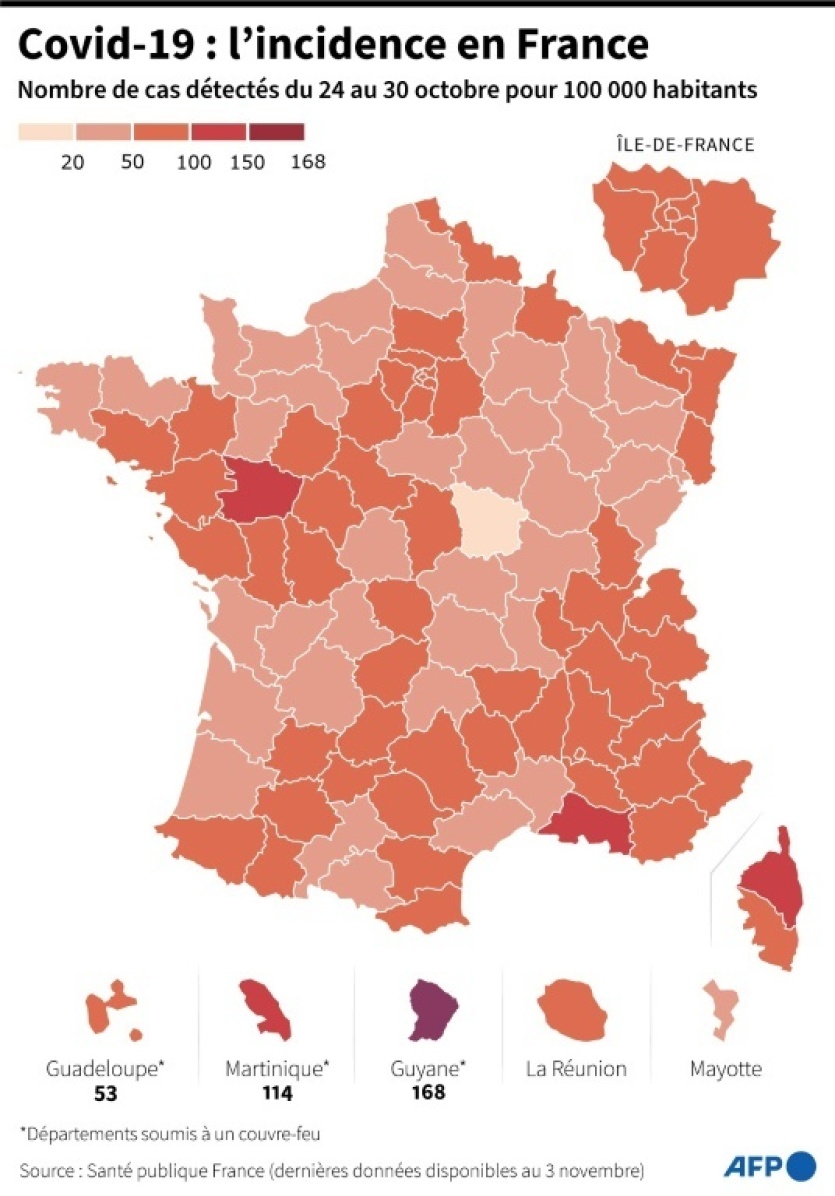 Cette semaine-là, le seuil de 50 nouveaux cas pour 100.000 habitants était dépassé "dans 44 départements métropolitains" et "en augmentation ou stable dans toutes les régions". Il atteignait par exemple 73 pour 100.000 habitants en Pays de la Loire, soit une augmentation de 52%.