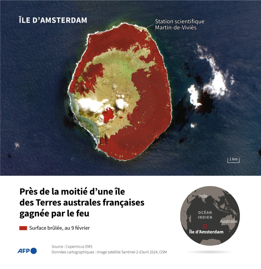 Infographie AFPSituée au milieu de l’océan Indien, à environ 2.800 km au sud-est de La Réunion, l’île Amsterdam est l’une des plus isolées au monde. Les 31 personnes – essentiellement des militaires et des scientifiques – qui étaient sur l’île quand l’incendie s’est déclenché ont toutes été évacuées par bateau dès le lendemain, le 16 janvier.