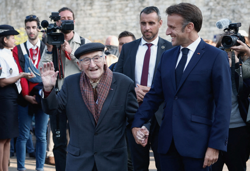 - AFP | Crée le 06.06.2024 à 16h30 | Mis à jour le 06.06.2024 à 16h31ImprimerLe président français Emmanuel Macron (à droite) marche avec Bernard Duval (à gauche), survivant du massacre de la prison de Caen en 1944. Alors que la nouvelle du débarquement allié se répand, le chef de la Gestapo qui dirige la prison de Caen ordonne l’ Photo Benoit TESSIER / AFPEmmanuel Macron a rendu hommage mercredi aux victimes civiles des bombardements alliés et loué "l’esprit de sacrifice" des libérateurs de la France au premier des trois jours de cérémonies pour le 80e anniversaire du Débarquement en Normandie, réunissant les principaux dirigeants occidentaux au moment où la guerre frappe à nouveau l’Europe.