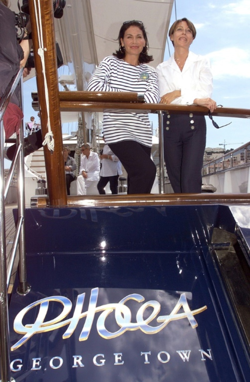 La milliardaire libanaise Mouna Ayoub (G) acompagnée de Maryline Vigouroux (D), présidente déléguée de l'Institut Mode Méditerranée, pose sur le pont du Phocea, le 09 juillet 1999 dans le vieux port de Marseille GERARD JULIEN [AFP/Archives]