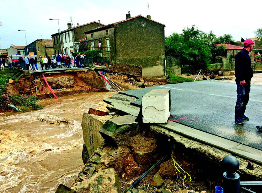 Le pont qui enjambait la rivière Trapel a été détruit par la force de l’eau dimanche à Villegailhenc, près de Carcassonne. Photo AFP
