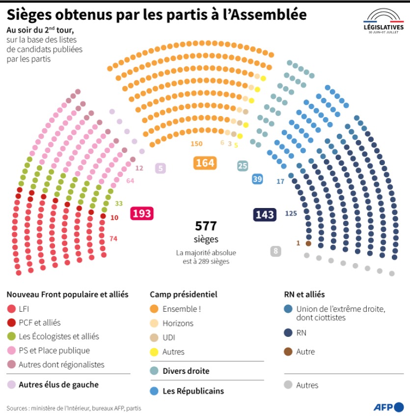 Infographie AFPA gauche, les rapports de force internes seront particulièrement décisifs dans les négociations, Insoumis comme socialistes tentant âprement de gonfler leurs rangs pour peser dans la désignation du Premier ministre potentiel. Mardi, Boris Vallaud (PS) a évoqué un contingent de 65 à 70 députés socialistes, quand Mathilde Panot (LFI) a assuré que LFI pourrait avoir un groupe "autour de 80 députés".