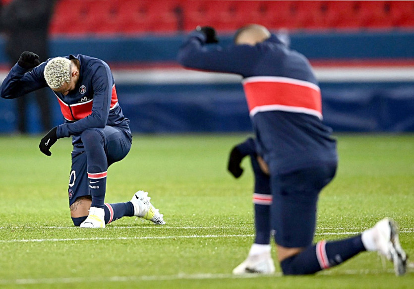 Neymar (à gauche) et Kylian Mbappé genou à terre contre le racisme avant la reprise du match de Ligue des champions du Paris SG contre Basaksehir Istanbul le 9 décembre 2020 au Parc des Princes