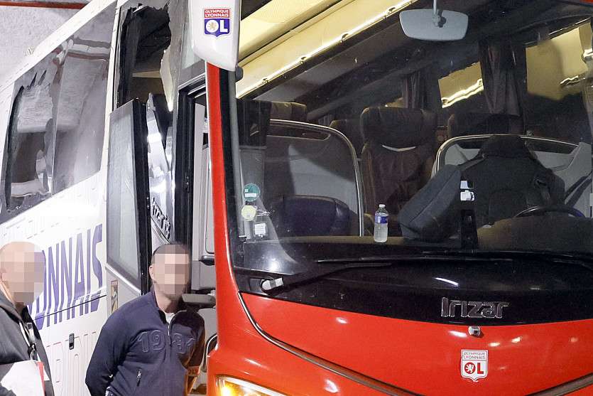 Vers 18h45, le bus de l’équipe de l’OL a été caillassé et quatre vitres ont été brisées, selon une source policière.