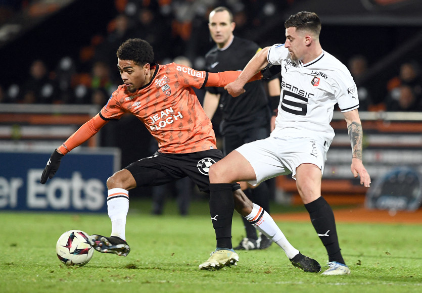 Julien Ponceau (à gauche) et ses coéquipiers de Lorient (6e) ont battu Rennes (5e) 2-1 samedi à domicile. Buts de Montassar Talbi (13e) et Théo Le Bris (31e) pour Lorient, et de Flavien Tait (73e) pour Rennes. Photo AFPMERCI DE VOUS IDENTIFIER