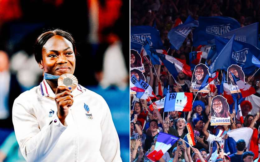 - AFP | Crée le 31.07.2024 à 10h01 | Mis à jour le 31.07.2024 à 10h01ImprimerClarisse Agbégnénou, double médaillée d’or à Tokyo, n’a pas réussi à conserver son titre malgré un stade tout acquis à sa cause. Elle repart tout de même avec une médaille de bronze. Photomontage DRL’or s’est dérobé… Clarisse Agbégnénou a abandonné son titre olympique conquis il y a trois ans à Tokyo pour une médaille de bronze en judo (-63 kg) mardi (la nuit dernière) aux JO-2024 à Paris, où les épéistes bleues ont empoché une médaille d’argent dans la compétition par équipes. Ces deux podiums portent à 18 le nombre de médailles françaises depuis le début des JO. De son côté, Léon Marchand a réussi la première partie de son défi : il s’est qualifié pour deux finales (200 m papillon et 200 m brasse) qui se disputeront mercredi (jeudi matin).